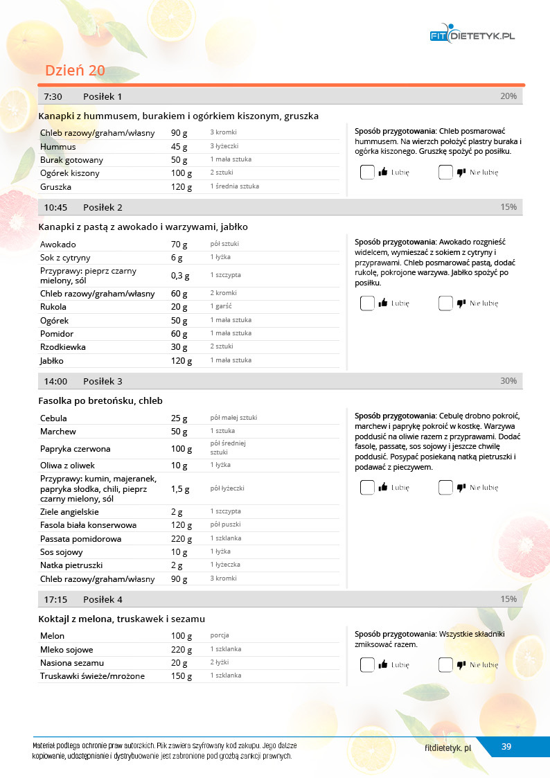 w formie precyzyjnych jadłospisów wielodniowych (na każdy dzień miesiąca jest opracowany osobny jadłospis). Tutaj nie musisz zastanawiać się co zjeść każdego dnia, gdyż będziesz mieć dokładnie wszystko rozplanowane.