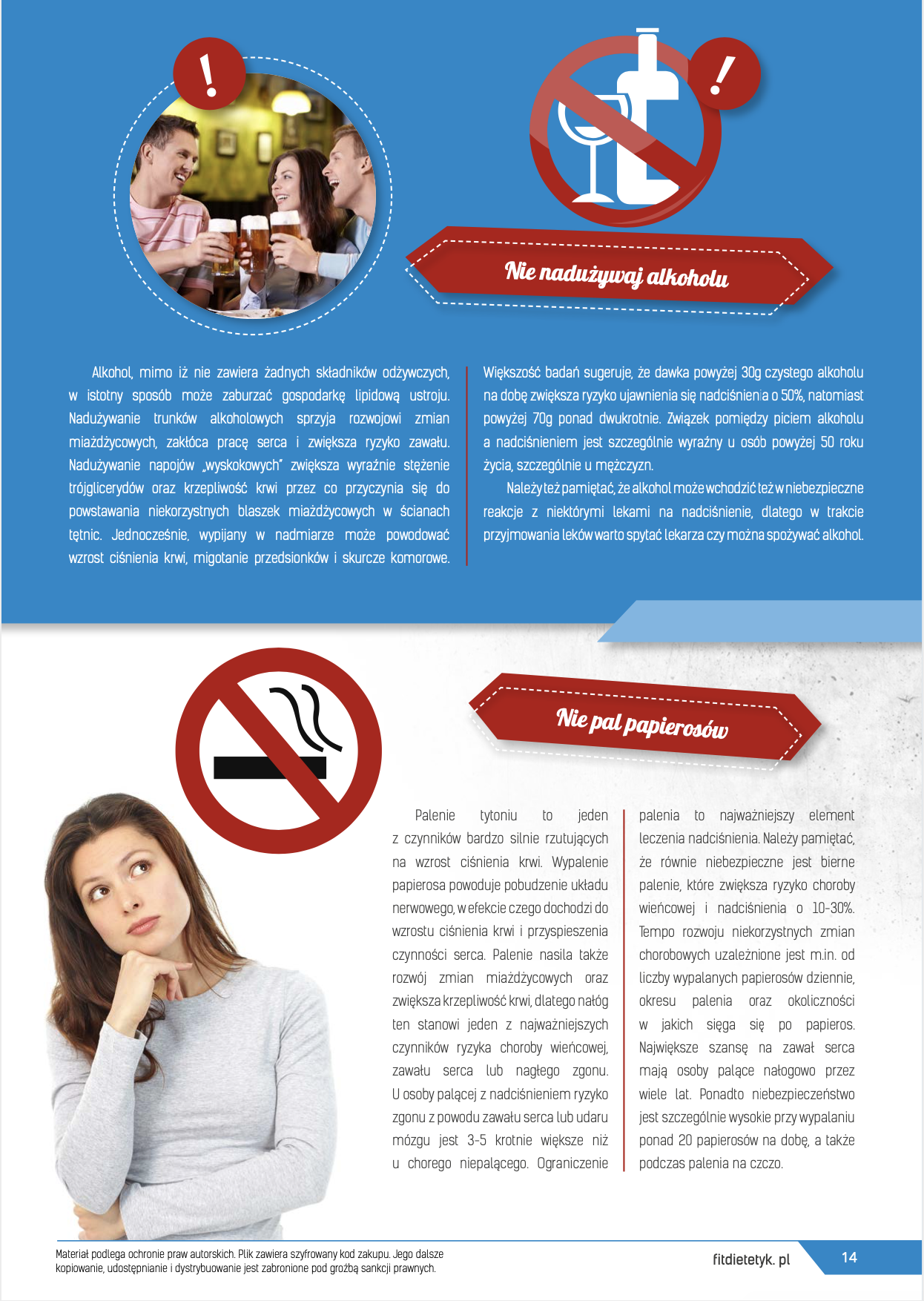Kompleksowy program żywieniowy dla KOBIET zmagających się z problemem nadciśnienia tętniczego. Opracowanie zawiera specjalnie przygotowany przewodnik edukacyjny oraz 30-dniowy jadłospis wspomagający redukcję podwyższonego ciśnienia krwi. W diecie zwrócono szczególną uwagę na podaż składników odżywczych wpływających na relaksację i zdrowie naczyń krwionośnych. Obok uwzględnienia ogólnych potrzeb żywieniowych kobiet zadbano m.in. o podaż odpowiedniej ilości sodu potasu, zachowanie odpowiednich proporcji między tymi składnikami a także dostarczenie zwiększonej ilości kwasów omega-3, które wpływają na procesy rozkurczowe naczyń krwionośnych. W przygotowanej diecie zwrócono także uwagę na ograniczenie podaży składników o działaniu miażdżycorodnym a także zwiększono podaż witamin chroniących naczynia krwionośne przed uszkodzeniem. Dieta sprawdzi się także idealnie w programach redukcji wagi u kobiet, w chorobach układu krążenia a także jako dieta po zawale.