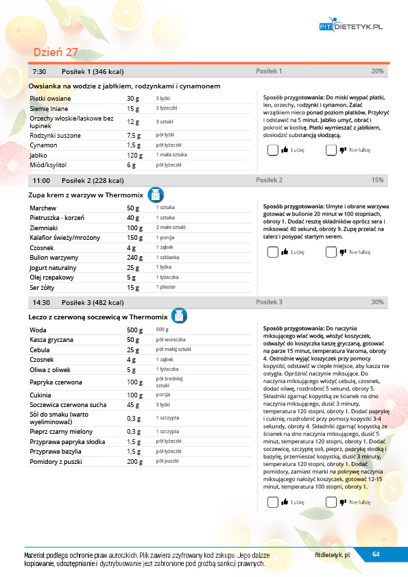 w formie precyzyjnych jadłospisów wielodniowych (na każdy dzień miesiąca jest opracowany osobny jadłospis). Tutaj nie musisz zastanawiać się co zjeść każdego dnia, gdyż będziesz mieć dokładnie wszystko rozplanowane.