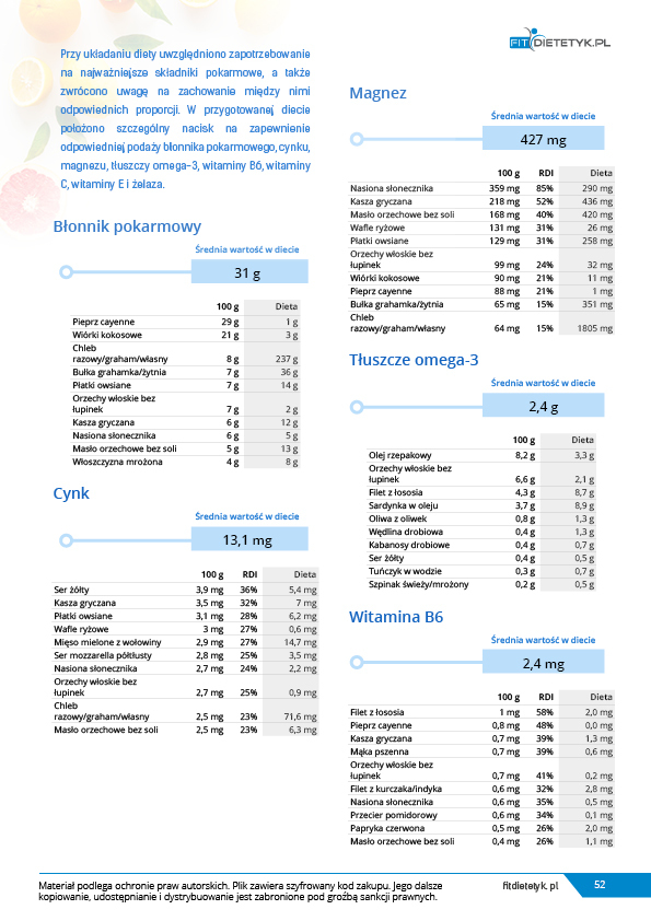 Kompleksowy program żywieniowy umożliwiający szybką i trwałą redukcję masy ciała u mężczyzn charakteryzujących się niewielką aktywnością fizyczną. Program zawiera szczegółowy, 30-dniowy jadłospis na 1800kcal uwzględniający 4 posiłki w ciągu dnia. Program realizuje potrzeby odżywcze organizmu mężczyzn a także wymagania związane z najczęściej występującymi wymaganiami zdrowotnymi (regulacja ciśnienia krwi, wspomaganie pracy serca i układu krążenia, regulacja hormonalna). Na podstawie zebranych doświadczeń, program żywieniowy został również dopasowany do gustów żywieniowych większości Panów, dzięki czemu będzie z całą pewnością chętnie realizowany. Obok walorów smakowych dieta jest również niezwykle wartościowa pod względem odżywczym. W jadłospisie zapewniono odpowiednio wysoką podaż rozmaitych witamin, minerałów i kwasów tłuszczowych, co zostało dokładnie wyszczególnione na końcu niniejszego opracowania.