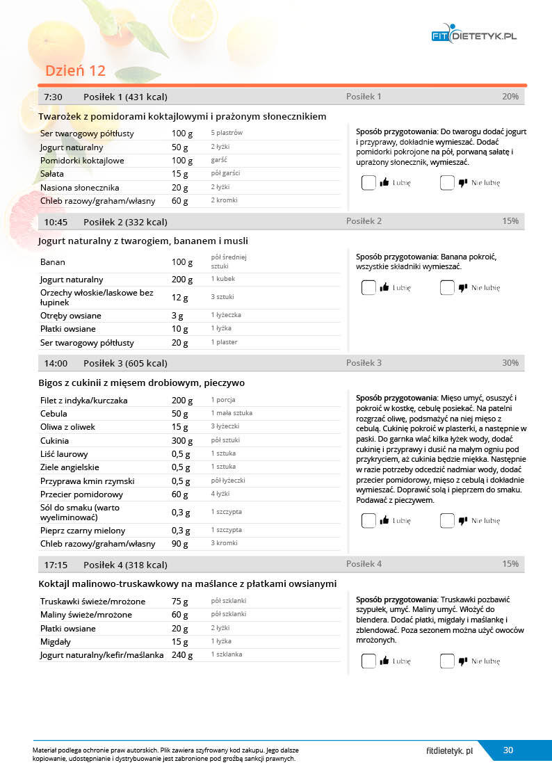 w formie propozycji posiłków (zamiast pojedynczych jadłospisów jednodniowych, przygotowano propozycje kilku propozycji dań na każdy posiłek). Tutaj nie uzależniamy Cię od tego jakie masz np. w danym dniu zjeść śniadanie czy obiad, tylko sam wybierasz sobie ulubione danie z kilku przedstawionych przez nas propozycji.