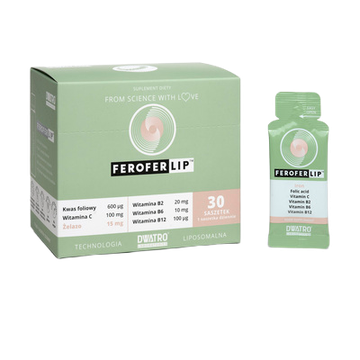 Wysokoprzyswajalne żelazo z kwasem foliowym, witaminą C oraz witaminami B2, B6 oraz B12 w postaci doustnego żelu liposomalnego.
